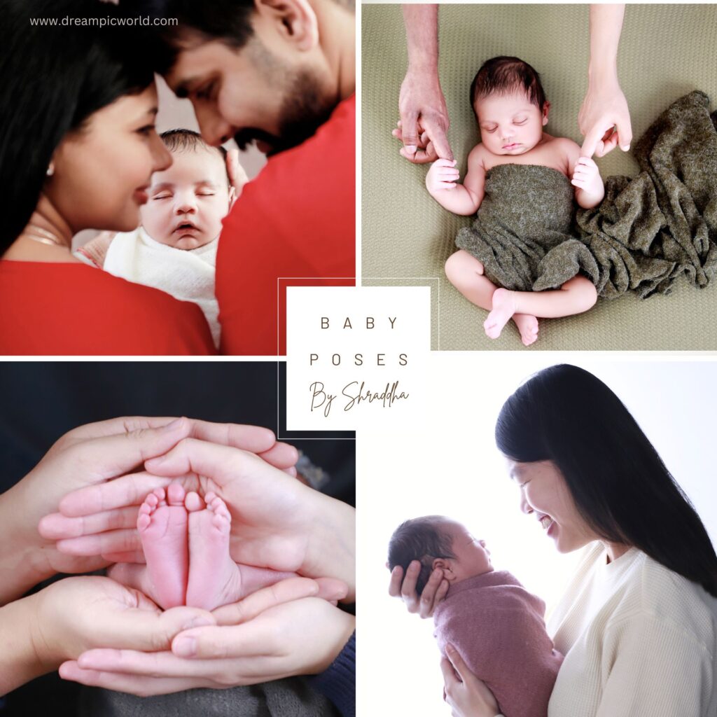 Gentle, creative newborn poses using soft wraps, delicate outfits, and safe props